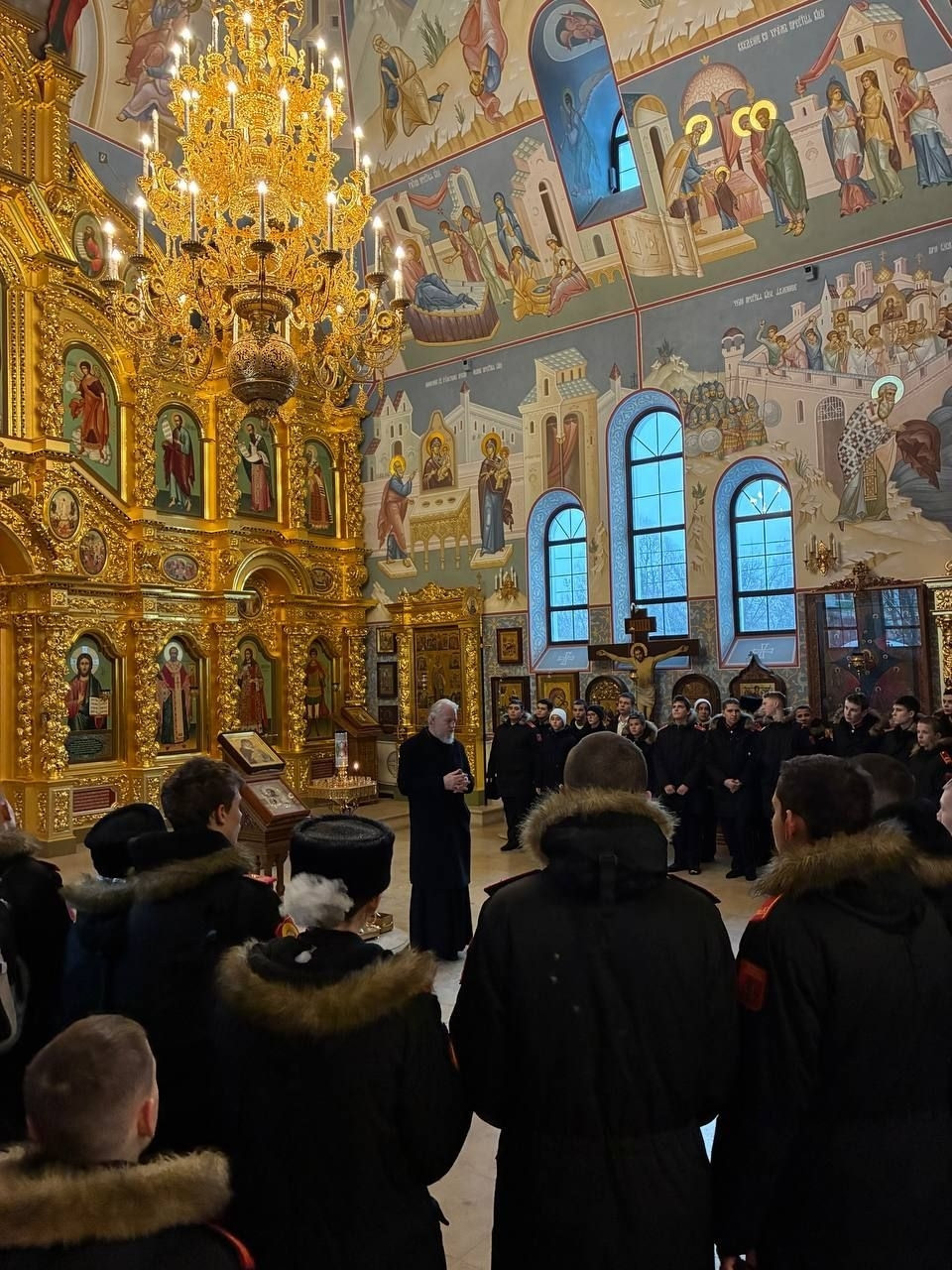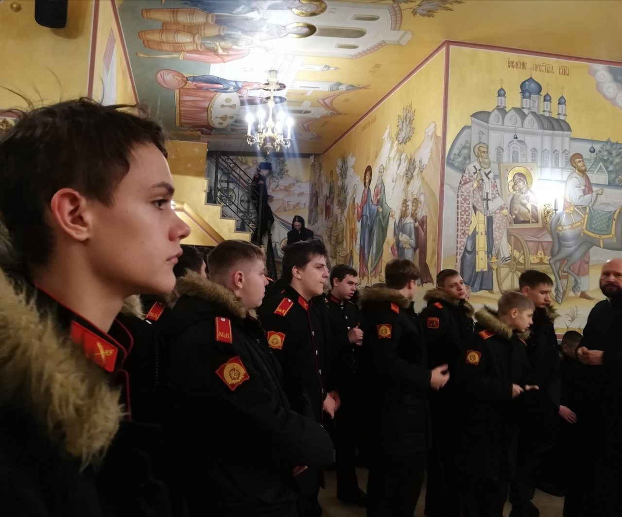 Батюшка поведал кадетам историю строительства храма, а также обратил внимание на фрески, отображаюшие основные знаковые исторические события связанные со Смоленским образом Богоматери. Также внимание ребят было обращено на великолепный иконостас и особо почитаемыемые верующими храмовые иконы.