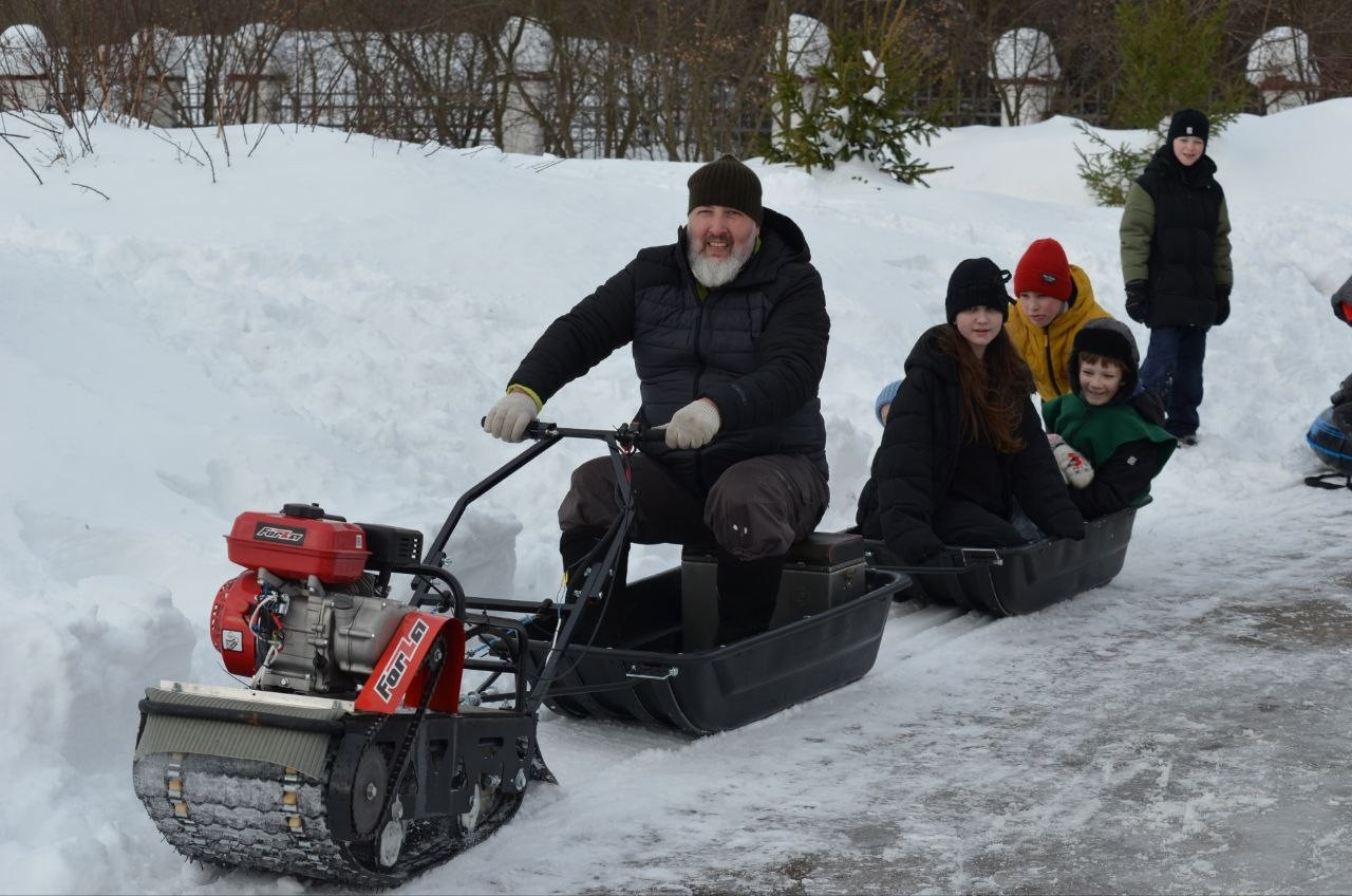В этом году Прощеное воскресенье выпало на февраль, когда погода стояла снежная, по-настоящему зимняя. И наш прихожанин Александр Коржиков придумал для детей очень интересную забаву. К маленькому трактору он привязал ледянки и таким образом катал всех детей! Дети были в восторге!