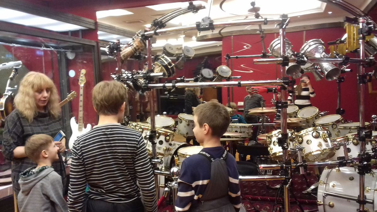 В конце экскурсии можно было попробовать поиграть на электро-гитаре, синтезаторе, барабанах и др. музыкальных инструментах. Больше всего детей впечатлили барабаны, от которых их было сложно оттащить.