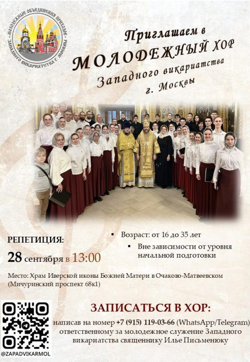 Для записи в хор напишите ответственному за молодежное служение Западного викариатства священнику Илье Письменюку по номеру телефона: +7 (915) 119-03-66 (WhatsApp/Telegram).