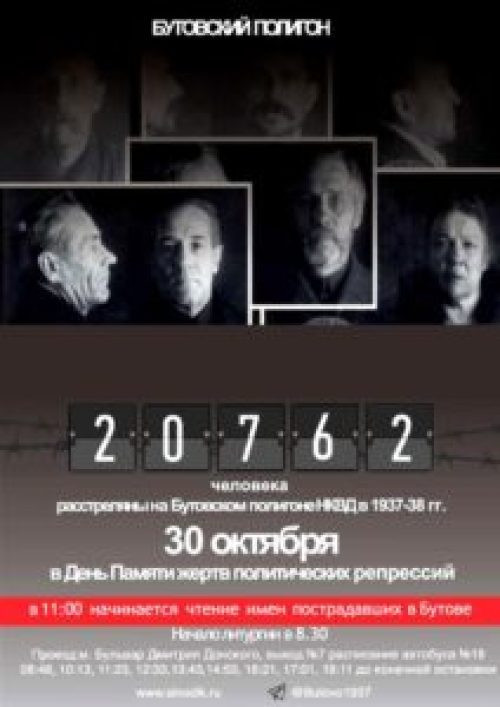 По окончании будет совершена панихида, после которой в 11:00 на территории захоронений перед мемориалом «Сад памяти» начнется чтение имен всех погибших в Бутове в соответствии с «расстрельными списками» НКВД, по дням приведения приговоров в исполнение.