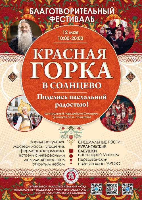 Благотворительный фонд «АПОСТОЛ» при поддержке храма преподобного Сергия Радонежского в Солнцеве 12 мая 2024 года организует благотворительный фестиваль «Красная горка в Солнцево», который пройдет на территории Центрального парка района (2 минуты от м. Солнцево).
