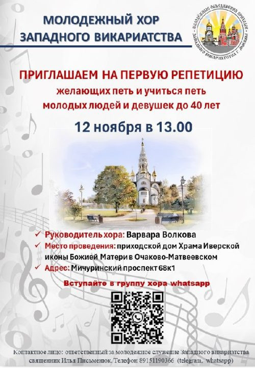 Первая репетиция молодежного коллектива состоится 12 ноября (воскресенье) в 13.00 в Храме Иверской иконы Божией Матери в Очаково-Матвеевском г. Москвы (адрес: Мичуринский проспект, 68, к.1). Приглашаются все желающие молодые люди и девушки!