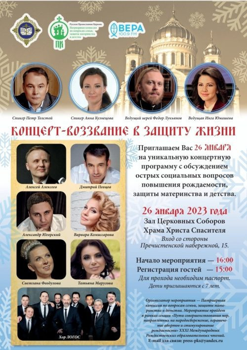 Приглашаем Вас 26 января на уникальную концертную программу с обсуждением острых социальных вопросов повышения рождаемости, защиты материнства в Зал Церковных Соборов Храма Христа Спасителя.