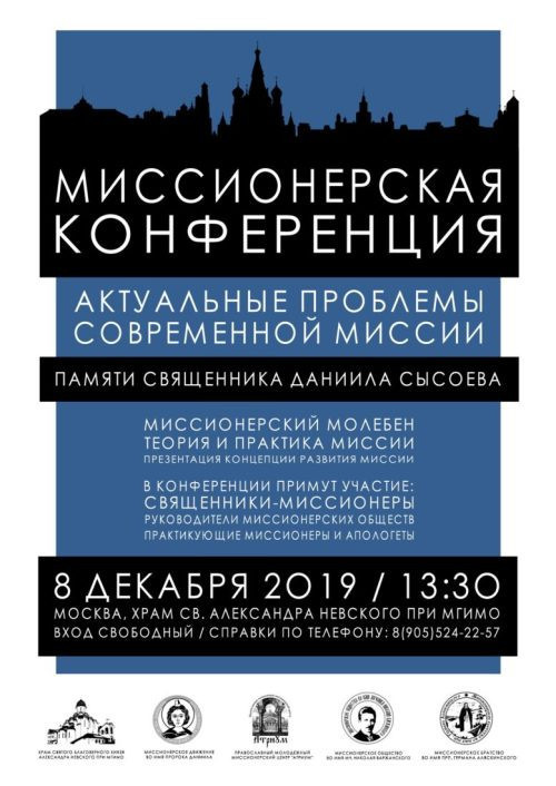 8 декабря 2019 года в храме благоверного князя Александра Невского при МГИМО состоится конференция «Актуальные вопросы современной миссии», посвященная десятилетию кончины священника Даниила Сысоева. Мероприятие пройдет по благословению руководителя Комиссии по миссионерству и катехизации при Епархиальном совете г. Москвы протоиерея Игоря Фомина.