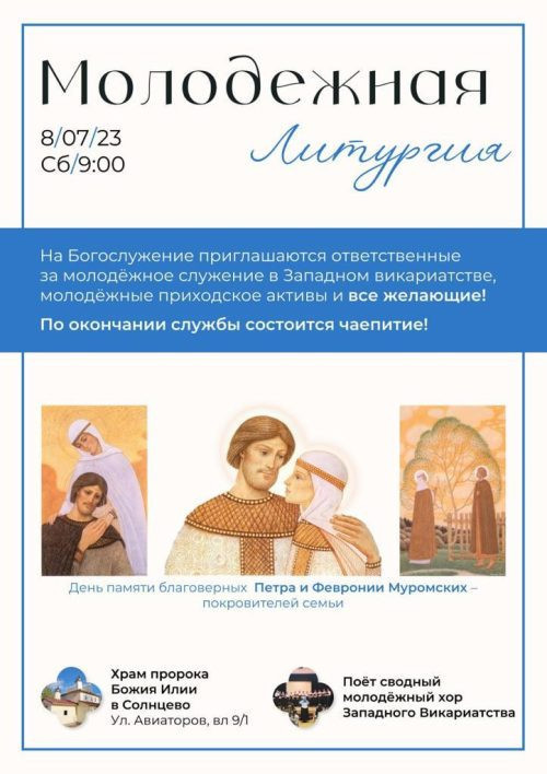 8 июля, в день памяти покровителей семей – святых благоверных Петра и Февронии Муромских, в храме Пророка Божия Илии в Солнцево будет совершена Божественная литургия с участием представителей молодежных объединений!