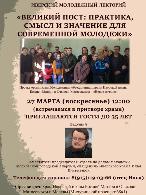 27 марта в рамках молодежного лектория Храма Иверской иконы Божией Матери в Очаково-Матвеевском состоится встреча на тему «Великий пост: практика, смысл и значение для современной молодежи».