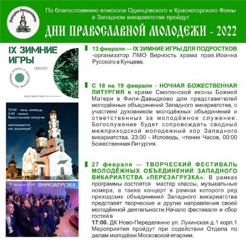 27 февраля — творческий фестиваль молодёжных объединений Западного викариатства «Перезагрузка». В рамках программы состоятся мастер классы, музыкальные номера, а также концерт в рамках которого ряд приходских объединений Западного викариатства представят творческие и другие направления своей молодёжной деятельности. Начало фестиваля и сбор гостей в 17:00. ДК Ново-Переделкино, ул. Лукинская д.1 корп.1