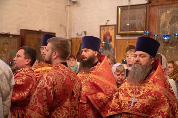 Его Высокопреосвященству сослужили настоятель храма Живоначальной Троицы в Троице-Голенищеве протоиерей Сергий Правдолюбов, настоятель храма прав. Иоанна Русского в Кунцеве протоиерей Андрей Смирнов, клирик Пермской епархии протоиерей Алексий Марченко, настоятель храма святого благоверного князя Александра Невского (Патриаршего подворья при МГИМО) протоиерей Игорь Фомин; клирики храма Живоначальной Троицы в Троице-Голенищеве: протоиерей Николай Кабанов, иерей Владимир Мандзюк-Ильницкий, иерей Максим Крижевский; а также и. о. настоятеля строящегося храма св. равноап. Марии Магдалины на Сетуни (Патриаршего подворья) иерей Алексий Меркишин.