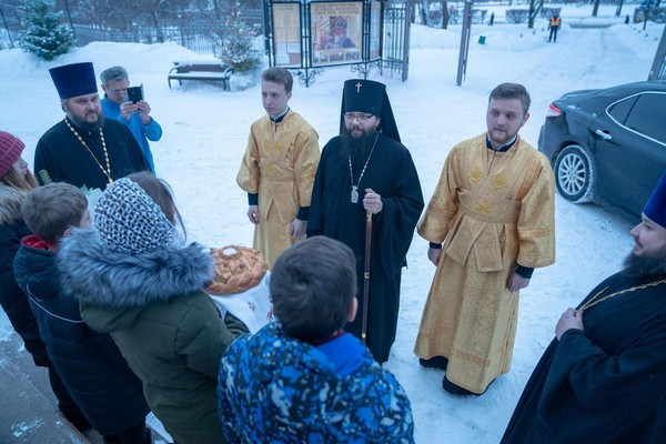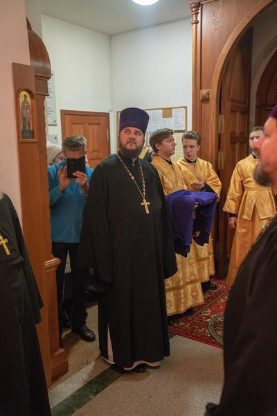 По окончании богослужения, настоятель храма обратился к Архиепископу Матфею с приветственным и поздравительным словом и преподнес в честь годовщины архиерейской хиротонии от храма дар — панагию с изображением Владимирской иконы Божией Матери.