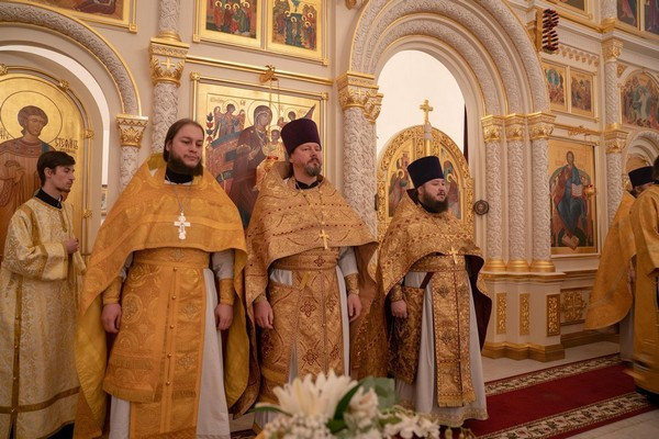 Его Высокопреосвященству сослужили: протоиерей Серафим Недосекин, благочинный Георгиевского округа, настоятель храма священник Александр Нарушев, секретарь Западного викариатства священник Алексей Дроздов, настоятель храма Благовещения Пресвятой Богородицы в Федосьино священник Андрей Пирог и клирики храма священник Александр Копяткевич, священник Анатолий Правдолюбов.