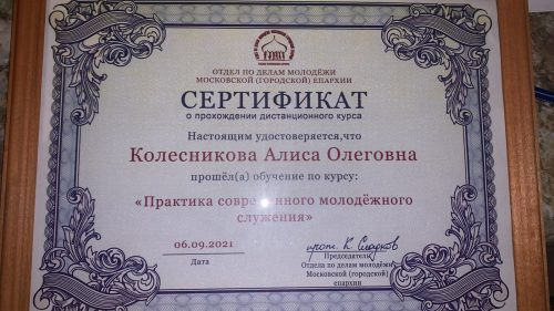 9 сентября 2021 года ответственная за молодёжное служение храма свт. Димитрия Ростовского в Очаково Алиса Колесникова успешно завершила дистанционное обучение «Практика современного молодёжного служения». Он был разработан и реализуется Отделом по делам молодёжи Московской городской епархии для представителей приходов города Москвы.