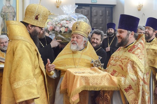 По окончании богослужения владыку Матфея приветствовал епископ Домодедовский Иоанн. От Западного викариатства поздравительное слово произнес благочинный Михайловского округа протоиерей Георгий Студенов и преподнес Его Высокопреосвященству панагию и букет цветов. Протоиерей Анатолий Алефиров, благочинный храмов Сергиевского округа, поздравил владыку Матфея от Северо-Восточного викариатства, вручив имениннику наперсный крест и цветы. От прихода храма настоятелем, протоиереем Андреем Смирновым, была передана в дар Его Высокопреосвященству икона праведного Иоанна Русского.