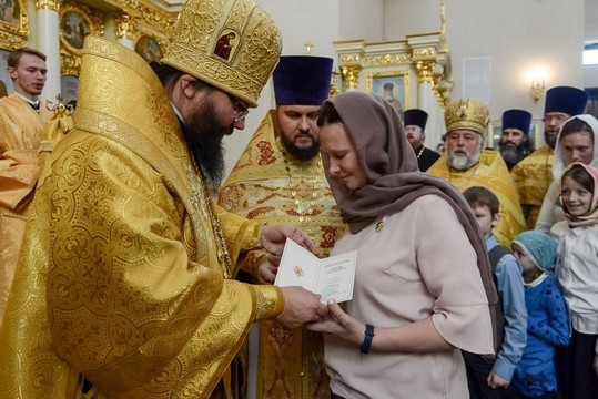 Затем Его Высокопреосвященство, по благословению Его Святейшества, Святейшего Патриарха Кирилла наградил Патриаршим знаком материнства 1 степени преподавателя воскресной школы храма праведного Иоанна Русского в Кунцеве Кузнецову Елену Вячеславовну. Патриаршего знака материнства 2 степени была удостоена Володина Анна Сергеевна, супруга священника Михаила Володина.