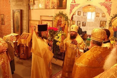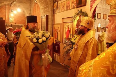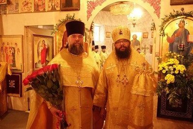 После Божественной Литургии Высокопреосвященнейший владыка Матфей поздравил настоятеля храма прот.Андрея Галухина с 50-летием и вручил ему памятный подарок.