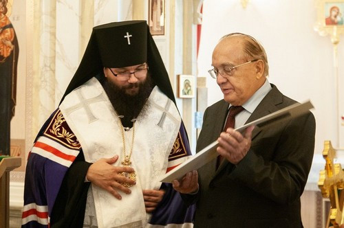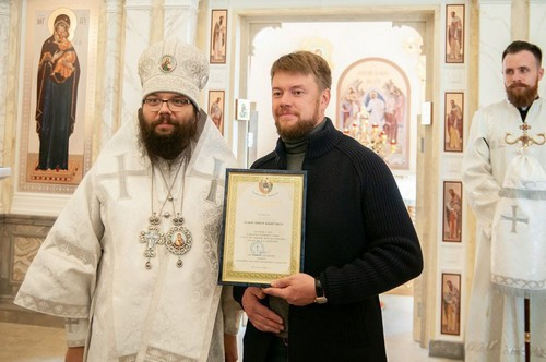 По окончании богослужения архиепископ Матфей обратился к собравшимся с проповедью и вручил благодарственные грамоты прихожанам, принявшим участие в строительстве временной церкви.