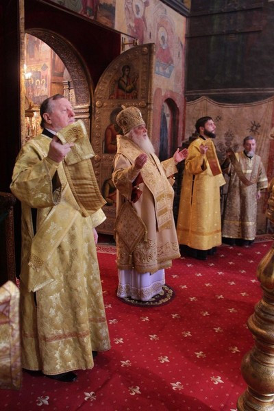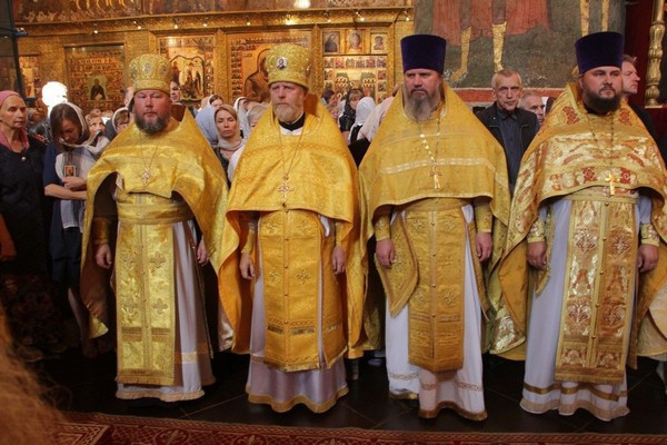 Его Высокопреосвященству сослужили: протопресвитер Владимир Диваков, секретарь Святейшего Патриарха по г. Москве; протоиереи: Александр Агейкин, настоятель Богоявленского кафедрального собора в Елохове, Сергий Гуданов, настоятель храма Живоначальной Троицы в поселке Мосрентген, Александр Кашкин, настоятель храма Влахернской иконы Божией Матери в Кузьминках, Олег Воробьев, благочинный храмов Даниловского церковного округа, Серафим Недосекин, благочинный храмов Георгиевского церковного округа, Алексий Муравейник, настоятель храма прп. Симеона Столпника за Яузой, Андрей Галухин, настоятель храма прп. Андрея Рублева в Раменках, Вячеслав Шестаков, настоятель Патриаршего подворья храмов в Зарядье, Михаил Прокопенко, клирик храма Живоначальной Троицы в Хорошеве, Кирилл Шевцов, настоятель храма Воздвижения Креста Господня в Алтуфьеве; протодиакон Валерий Щеглов, клирик храма Воскресения Христова в Сокольниках; диакона: Сергий Сальников, клирик храма Софии, Премудрости Божией, в Средних Садовниках, Виталий Гасанов, клирик храма свв. Девяти мучеников Кизических, Александр Сухоруков, клирик храма новомучеников и исповедников Российских в Строгино, Александр Корновян, клирик храма иконы Божией Матери «Знамение» в Ховрино.