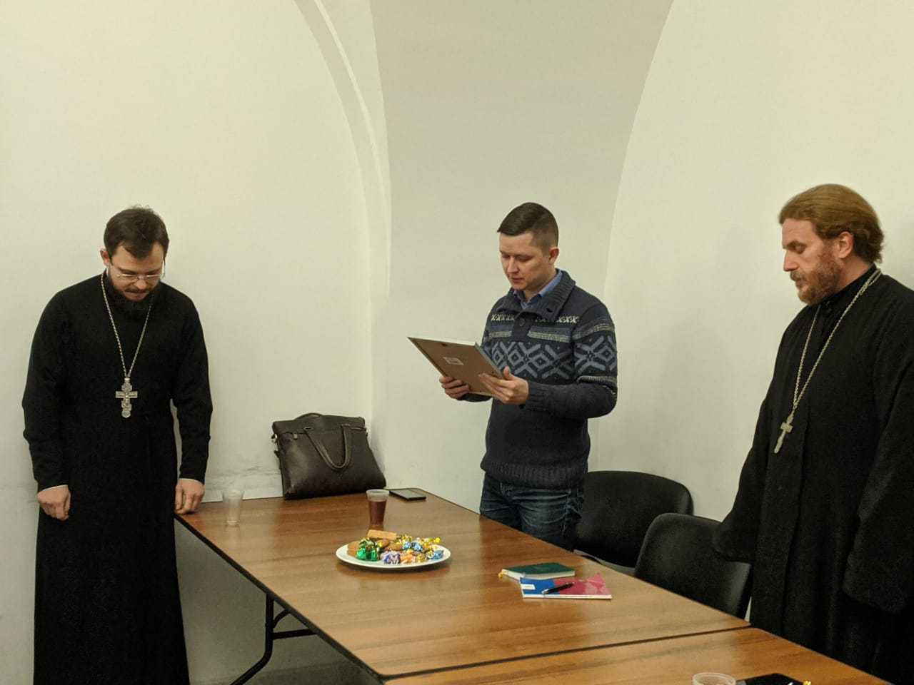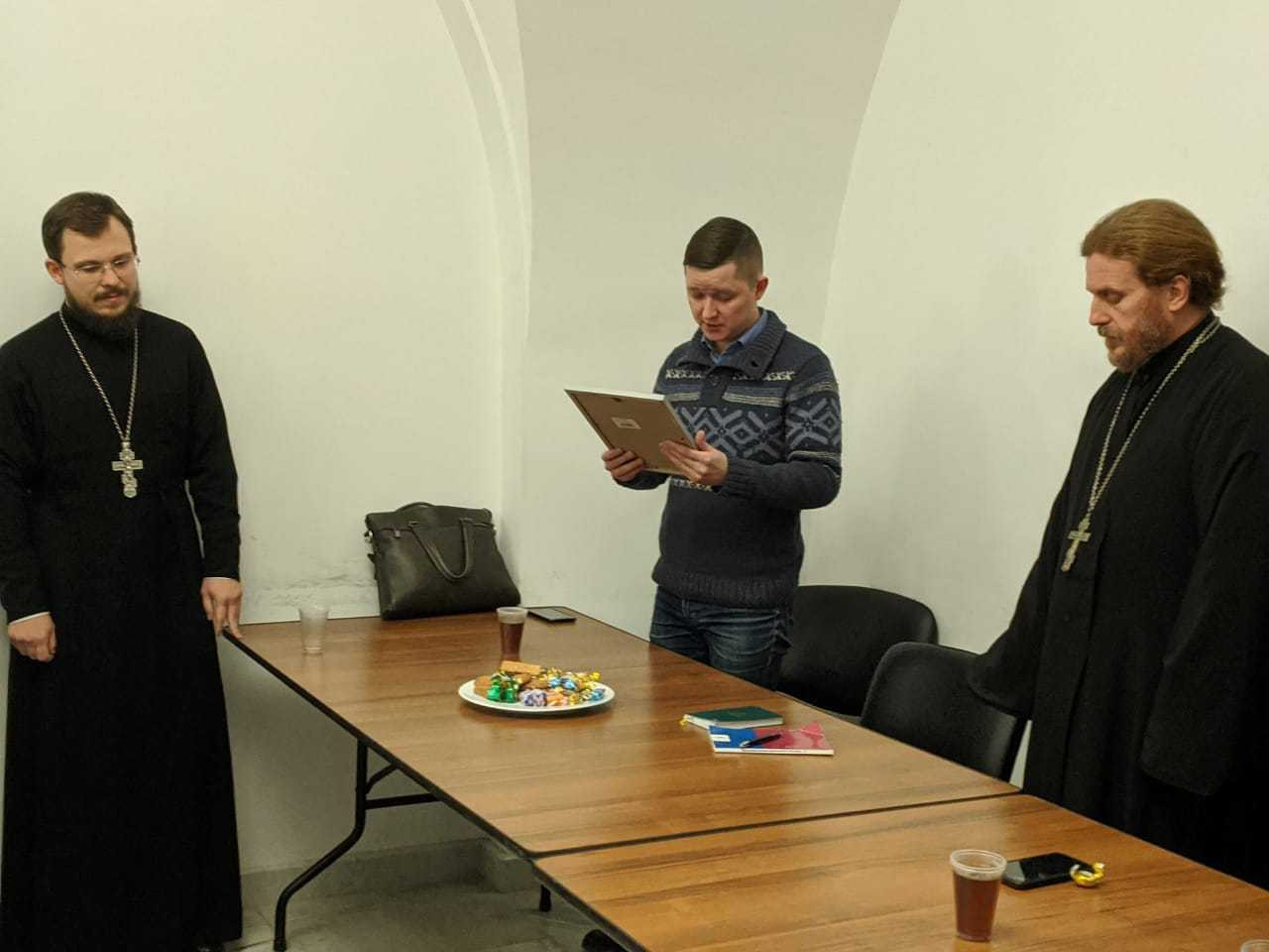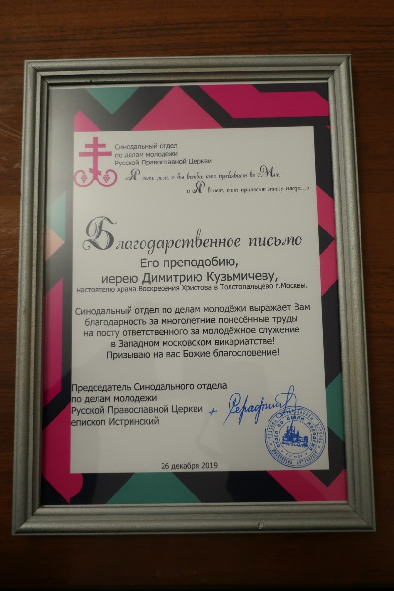 По завершении молебна иерей Димитрий поблагодарил всех за многолетнюю совместную работу на ниве молодёжного служения и представил новоназначенного помощника викария по молодёжному служению в Западном викариатстве — священника Алексия Соловьёва, являющегося заместителем председателя Синодального отдела по делам молодёжи Русской Православной Церкви. Отец Алексий, в свою очередь, передал слова благодарности от имени управляющего викариатством, а также огласил слова благодарственной грамоты Синодального отдела по делам молодёжи, которую вручил отцу Димитрию.