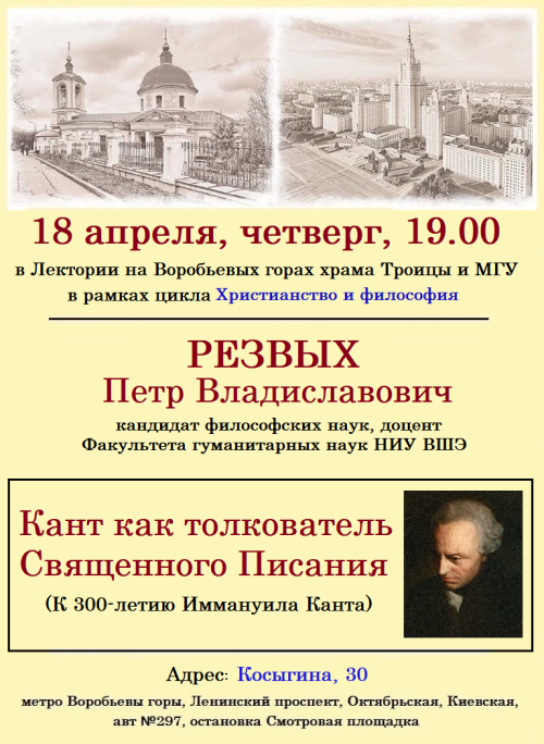 18 апреля, в четверг, в 19.00 в Лектории на Воробьевых горах храма Троицы и МГУ в рамках цикла «Христианство и философия», к 300-летию Иммануила Канта: выступает Петр Владиславович РЕЗВЫХ, кандидат философских наук, доцент Школы философии и культурологии Факультета гуманитарных наук НИУ ВШЭ, по теме «КАНТ КАК ТОЛКОВАТЕЛЬ СВЯЩЕННОГО ПИСАНИЯ».Приглашаем всех желающих! Вход свободный!