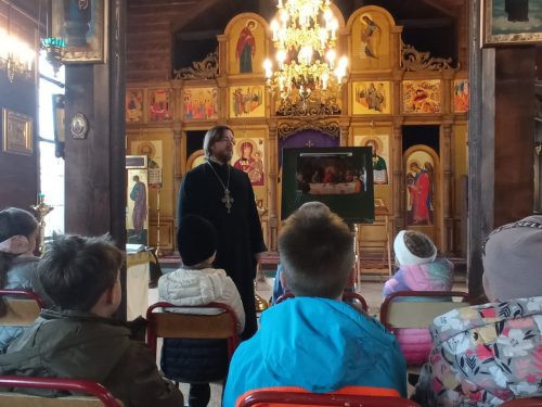 Занятие прошло непосредственно в храме. Дети узнали, в чем смысл Святой Четыредесятницы как времени подготовки к достойной встрече светлого праздника Пасхи Христовой, познакомились с неделями Великого поста и с событиями Страстной седмицы.