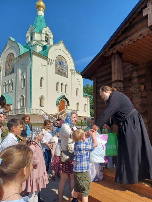 По окончании молебна перед началом учебного года, настоятель храма иерей Александр Нарушев вручил вещи и необходимую школьную канцелярию многодетным и нуждающимся семьям прихода.