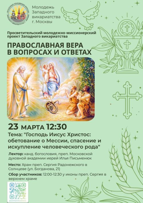 Вторая встреча просветительского молодежно-миссионерского проекта Западного викариатства г. Москвы «Православная вера в вопросах и ответах» состоится в храме преподобного Сергия Радонежского в Солнцеве (ул. Богданова, 21).