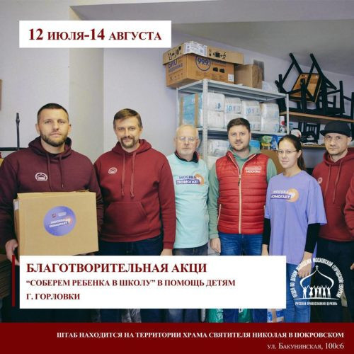 С 12 июля по 14 августа 2024 года Отдел по делам молодежи Московской (городской) епархии проводит благотворительную акцию «Соберем ребенка в школу», в рамках которой осуществляется сбор гуманитарной помощи для детей из г. Горловки Донецкой Народной Республики. С 2022 года в рамках этой акции на новые территории Российской Федерации передали свыше 90 тысяч единиц товаров.