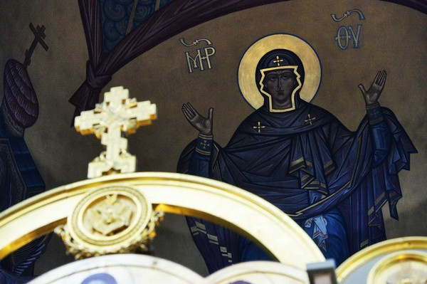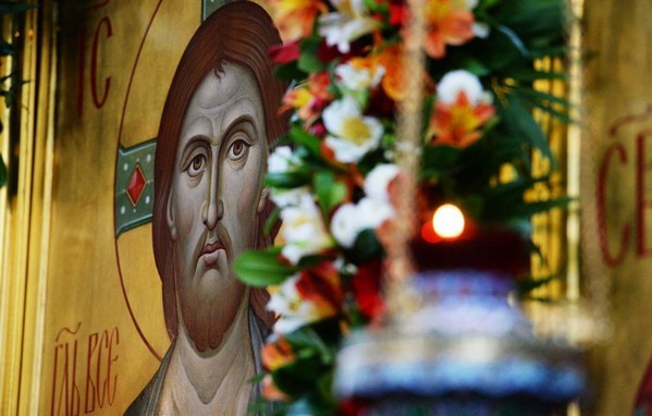 Настоятель храма-памятника протоиерей Серафим Недосекин приветствовал Святейшего Владыку и преподнес Его Святейшеству икону Воскресения Христова.