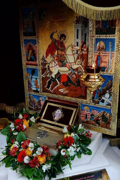 По окончании Литургии Святейший Патриарх Кирилл совершил славление и молитву у ковчега с частицей мощей святого великомученика Георгия.