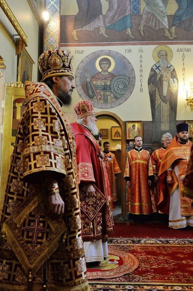 Его Святейшеству сослужили: архиепископ Солнечногорский Сергий, руководитель Административного секретариата Московской Патриархии; епископ Егорьевский Тихон, председатель Патриаршего совета по культуре, наместник Сретенского ставропигиального монастыря, управляющий Западным викариатством г. Москвы; протопресвитер Владимир Диваков, секретарь Патриарха Московского и всея Руси по г. Москве; протоиерей Серафим Недосекин, благочинный Георгиевского округа, настоятель Георгиевского храма-памятника на Поклонной горе г. Москвы; протоиерей Андрей Марущак, клирик Храма Христа Спасителя г. Москвы; столичное духовенство.