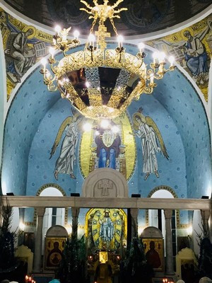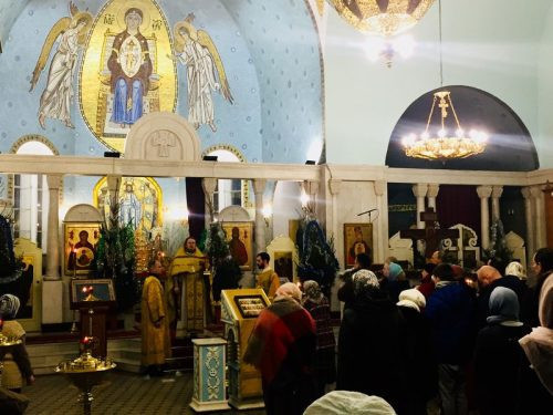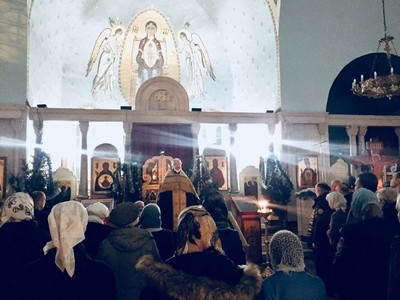 В ночном храме среди украшенных елей уже ощущается атмосфера праздника, Церковь вступила в празднование Рождества, до которого остаются считанные дни.