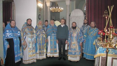 Его Высокопреосвященству сослужили: благочинный Георгиевского округа, настоятель храма вмч. Георгия Победоносца протоиерей Серафим Недосекин, настоятель храма Покрова Пресвятой Богородицы в с. Акулово Московской области протоиерей Валериан Кречетов, благочинный Москворецкого округа, настоятель Храма Спаса Преображения на Болвановке протоиерей Николай Кречетов, ректор Перервинской духовной семинарии, настоятель Патриаршего подворья храмов Николо-Перервинского монастыря в Москве протоиерей Владимир Чувикин, исполняющий обязанности наместника Заиконоспасского монастыря иеромонах Даниил (Константинов), насельник пермского Богоявленского монастыря иеромонах Андроник (Шумкин), насельник Успенского Иосифо-Волоцкого монастыря иеромонах Пафнутий (Попов), а также клирики нашего храма иерей Александр Досталь, иерей Иоанн Коханов, иерей Александр Дроздов, иерей Павел Ефремов. Диаконский чин возглавил протодиакон Сергий Шевелкин, клирик храмов Николо-Перервинского мужского монастыря г. Москвы в сослужении клирика Свято-Троицкой Сергиевой Лавры протодиакона Иоанна Дикого. За богослужением молился губернатор Чукотского автономного округа Копин Роман Валентинович.