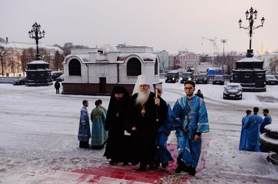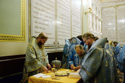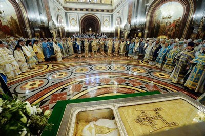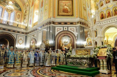 В центре Храме Христа Спасителя была установлена рака с честными мощами святителя Тихона, Патриарха Московского, которые 29 ноября с.г., к началу Архиерейского Собора Русской Православной Церкви, были принесены в кафедральный собор из Донского ставропигиального мужского монастыря.