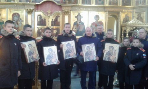 Затем, социальный работник храма Старунов В.Н. вручил преподавателям и офицерам суворовского училища 14 икон Божией Матери «Воспитание». Иконы были изготовлены на церковном предприятии ХПП «Софрино» по заказу нашего храма специально для раздачи учителям и воспитателям школ, училищ, детских садов и других учебных заведений.