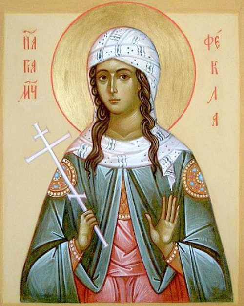 Святая первомученица равноапостольная Фекла родилась в малоазийском городе Икония в богатой семье и отличалась необыкновенной красотой. В 18 лет ее обручили знатному юноше. В это время Иконию посетили святые апостолы Павел и Варнава, о чем говорится в 14-й главе Книги Деяния. Там они поселились в доме Онисифора, о котором упоминает Павел в 2-м Послании к Тимофею. В Иконии апостолы довольно успешно проповедовали в синагоге и доме Онисифора, творя чудеса и знамения, и приобрели много новых душ для Христа.