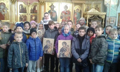 В завершении экскурсии учителям школы были вручены три иконы Божией Матери «Воспитание» и сделаны фотографии на память.