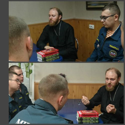 16 сентября, клирик храма в честь Смоленской иконы Божией Матери свящ. Владимир Хажомия провел беседу с воинами ЦРЦ ГОЧС МЧС. Темой послужил праздник отмечаемый верующими 11 сентября — Усекновение главы Пророка, Предтечи и Крестителя Господня Иоанне. Помимо этого были затронуты вопросы духовности( бездуховности) человека в наши, а также батюшка подробно ответил на вопросы спастелей МЧС. По окончании встречи о.Владимир передал огнеборцам, для душеполезного чтения, Православную литературу; с прошедшими Днями рождений поздравлены именинники.