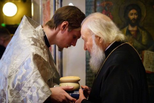 За Литургией Святейший Патриарх Кирилл рукоположил диакона Дионисия Семенова, клирика храма святителя Иоанна Русского в Фили-Давыдкове, в сан пресвитера.