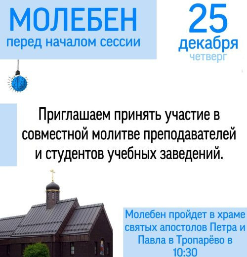 25 декабря, в четверг, в храме святых апостолов Петра и Павла в Тропарёво, после Божественной Литургии (в 10:30), будет отслужен молебен перед началом экзаменационной сессии.