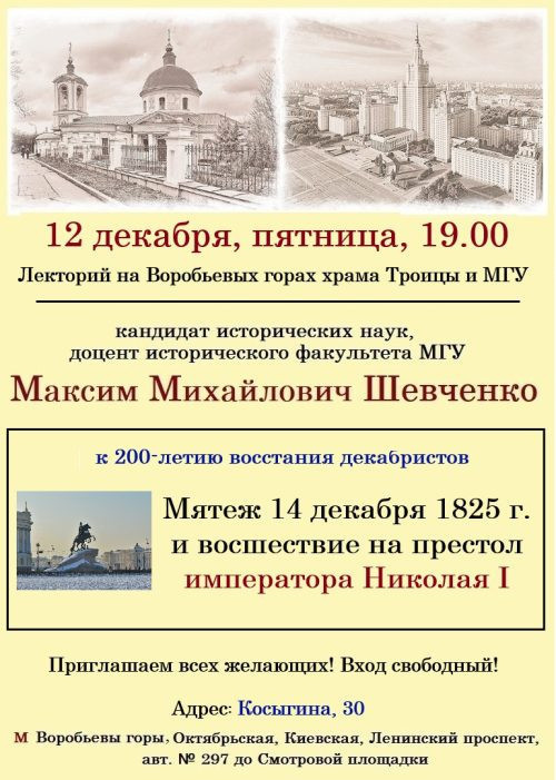 К 200-летию восстания декабристов, произошедшего в декабре 1825 года, в Лектории на Воробьевых горах храма Троицы и МГУ с докладом на эту тему выступит кандидат исторических наук, доцент исторического факультета МГУ Максим Михайлович Шевченко. Тема доклада: «14 декабря 1825 года и восшествие на престол императора Николая I»