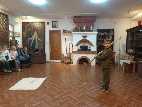 Дети могли увидеть и подержать в руках семена не только льна, но и пшеницы, ржи, овса и проса. Узнали, почему лён не жали серпами, как рожь и пшеницу, а выдергивали из земли вручную вместе с корешками. Затем мальчики попробовали, каково это молотить лён настоящим цепом (сцепленные между собой палки). В целом, все предметы, представленные в музее, настоящие. Многим из них более 100 лет! И сделаны они все вручную искусными мастерами.