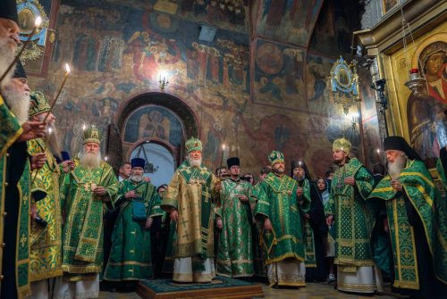 В храме молились архиереи, настоятельницы женских монастырей, священнослужители, монашествующие и паломники, прибывшие на торжества в лавру.