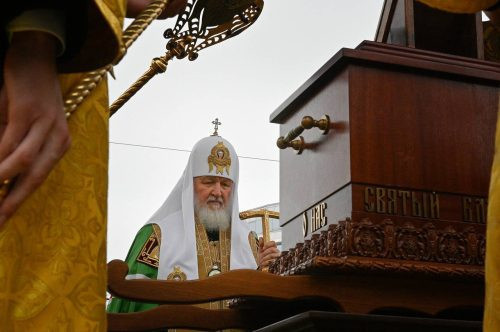 Честные мощи были установлены на специальном помосте с сенью. Предстоятель Русской Православной Церкви совершил молебное пение благоверному великому князю Александру Невскому.