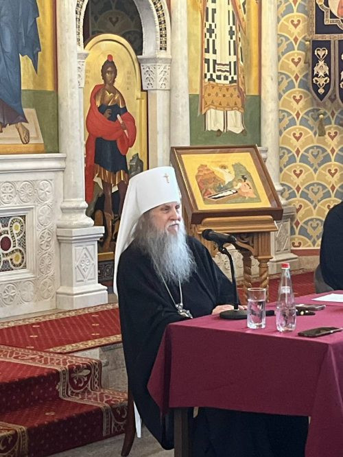 В этот же день прошла встреча с митрополитом Ионафаном – духовным композитором, переводчиком литургических и духовных текстов. Приветственное слово владыки началось с выражения искренней благодарности всем присутствующим за молитвы и отметил важность общей молитвы за Украинскую церковь. В ходе душевной беседы с прихожанами нашего храма владыка ответил на многочисленные вопросы, затронув различные аспекты духовной жизни и церковного искусства. Архипастырь акцентировал внимание на глубоком символизме своего произведения «Литургия Мира», название которого пишется с большой буквы неслучайно – оно отражает Мир Божий, о котором говорится в священных текстах: «Слава в вышних Богу, и на земле мир, в человеках благоволение».