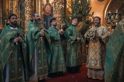 По окончании Литургии архиепископ Одинцовский и Красногорский Фома совершил великую вечерню праздника Пятидесятницы с чтением коленопреклонных молитв.