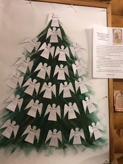 На каждом — имя ребенка и подарок, который он хотел бы получить на Рождество Христово. Можно выбрать любого ангелочка, а далее либо купить подарок самому, либо пожертвовать сумму до 500 рублей (на подарок). Подарок и пожертвование передать соцработнику