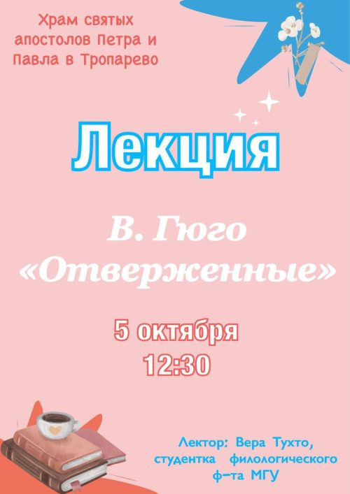 В воскресенье, 5 октября, в 12:30, в храме святых апостолов Петра и Павла в Тропарево, в рамках Литературно- философского кружка, состоится первая часть лекции по роману Виктора Гюго «Отверженные».