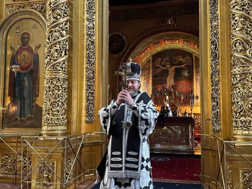 3 апреля 2025 года, Четверток Великого канона, архиепископ Одинцовский и Красногорский Фома совершил Литургию Преждеосвященных Даров в Богоявленском кафедральном соборе в Елохово.