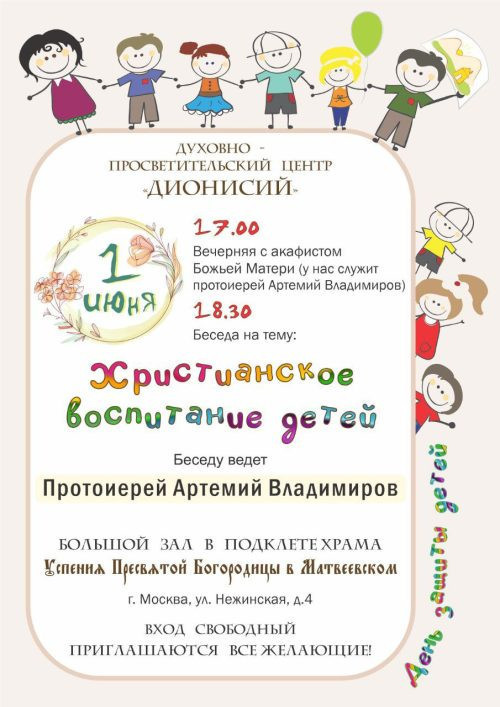 В 18.30 в подклете храма отец Артемий проведет беседу на тему «Христианское воспитание детей».