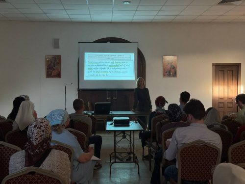 Елена Евгеньевна рассказала о том, что затрудняет понимание церковнославянских текстов (подстрочные знаки – титлы, ударения), коснулась темы грамматики (особые формы, которых нет в русском языке). Также преподаватель обратила внимание на встречающиеся в богослужебных текстах слова, имеющие в русском языке противоположное значение.